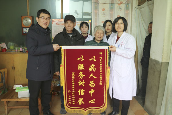 其后,他们来到行唐故郡村,得知我院领导前来,患者握住何宏涛副院长的手哽咽地说不出话来。其家人告诉我们,患者在宁养院免费领取止痛药已有一年时间了,医护人员多次上门的探访与关心支持让患者生活质量提高很多,老人一直想表达感谢,却没有机会,这次何副院长与张主任的到来使病人十分激动,其感激之情溢于言表。