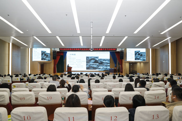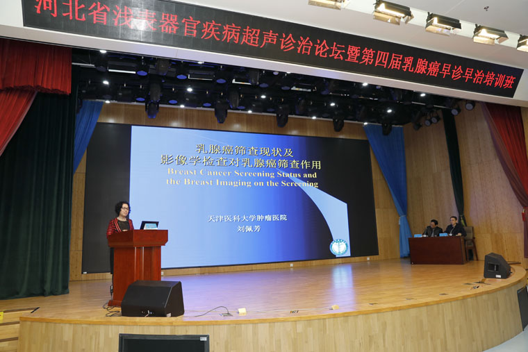 河北省浅表器官疾病超声诊治论坛特别邀请了国内著名的甲状腺、乳腺专家,天津医科大学肿瘤医院乳腺影像诊断科刘佩芳教授,吉林大学中日联谊医院超声科主任王辉教授,中山大学肿瘤防治中心超声科副主任林僖教授,北京解放军总医院超声诊断科副主任王知力教授就目前该领域的超声诊断规范、研究进展进行了深入讲解。我院副院长耿翠芝教授就乳腺外科与超声需要沟通的七个方面的问题进行阐述,超声科副主任纪晓惠副教授、张凤娟副教授和周军华副教授就超声引导下乳腺疾病及引流区淋巴结的介入操作规范及特殊病例进行了分享,尤其是特殊病例讨论环节,他们以真实病例现身说法,探讨超声检查规范、诊断误区及陷阱,使学员获益颇多。