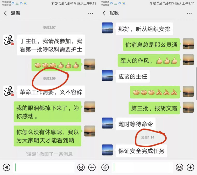 时间回到1月25日晚上23点,呼吸内科丁翠敏主任接到医院任务,要求26日上午8点前将支援前线的名单报上去。“科里绝大多数人没有任何思想准备,在半夜里,9个小时内要沟通、拿出名单,当时我真的愁坏了……”但当丁主任把消息发到科室微信群中后,源源不断的请战信息让她湿了眼眶。
