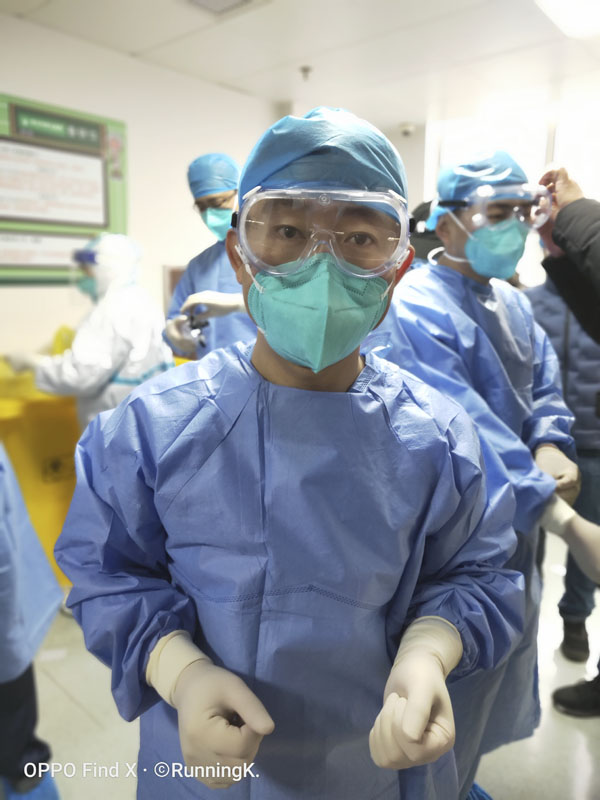 我们的医生、护士已基本熟练日常工作,对于防护工作,我们一直进行着严格的培训,大家相互检查、纠正、督促。重症医学科的病人情况较重,呼吸机、监护措施都要到位。穿防护服进行工作和平日里的工作并不相同,会受到很多限制,人力、物力也都会增加。但是大家不叫苦、不叫累,努力适应这里的一切。