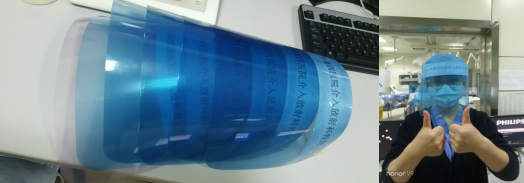 疫情漫延,医用防护用品紧张,夏青青、申利捷等同志,积极主动利用胶片,自制防护面屏,在放射科、介入导管室、介入病区使用,还自制20多个无偿提供给其他科室,减轻了医院负担,支援了我院抗疫工作。