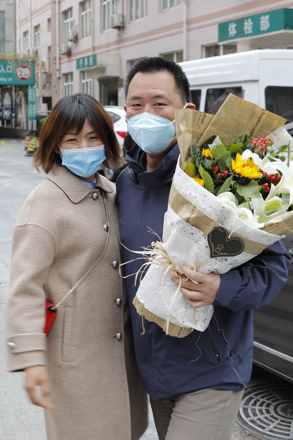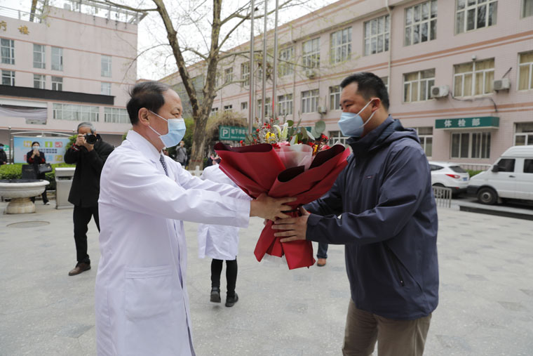 在医院前厅广场,党委书记单保恩、院长徐金升和医院领导班子全体成员、部分干部职工及其家属一起迎接他回家。单保恩书记代表院党委向刘辉及其家属表示敬意和感谢。