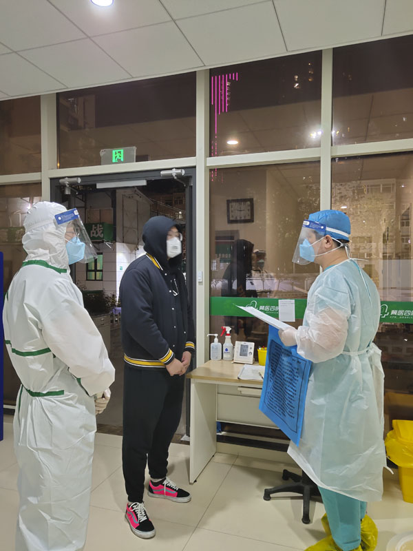 在隔离病房,患者身边没有亲人,容易产生孤独恐惧心理,医护人员除了为患者做好咽拭子采集,输液治疗及生活帮助外,还要更多关注患者心理变化并及时沟通给予安慰,缓解其紧张情绪。有一位发热患者是哺乳期的妈妈,在得知自己要被隔离留观时显得很无措。医生一遍又一遍地为其耐心讲解病情及留观的必要性,解除其顾虑直到患者配合治疗。有一位17岁的高三学生在留观后担心网课没法上,护士们赶紧找到了插线板,帮助他连接发热诊区的WiFi,就这样把网课搬进了隔离病房,一边输液一边上课。还有一位年轻的患者半夜突然胃不舒服,没来得及去卫生间就吐在病房了,护士们赶紧跑来清理,她站在床旁一脸歉疚,护士们连连安慰她,她如释重负地说道:“给你们添麻烦了,谢谢……”