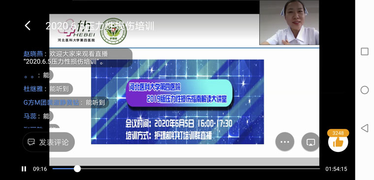 听了两位老师的讲课,让我受益匪浅。尹护士长耐心的讲解,压力性损伤的分期及形成的原因,尤其是当她讲到,压力性损伤是由内到外,从深到浅,让我更新了观点。还有申护士长结合自身临床的工作经验,生动形象的讲解,他提出知信行的观念,给我们在今后预防压力性损伤指明了方向。另外这次培训我是在家休息时登陆钉钉参加的,并且足不出户和尹老师进行了交流。培训后我又观看了直播回放,巩固了指南中的更新点。真心喜欢这种培训方式。今后我会不断的学习新知识,提高专业能力为病人更好的服务。