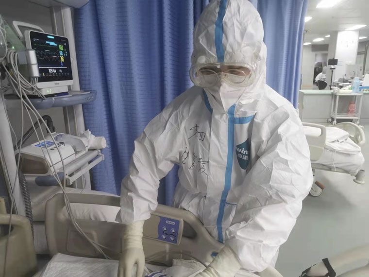 在这里收治的都是全市最危重的新冠肺炎患者,病情复杂多变,生活自理能力差。部分病人因病情需要给予了有创呼吸机和ECMO治疗,俯卧位通气,一个看似简单的翻身动作,也需要多人协作才能完成,耗费巨大的体力。因为患者生活自理能力差,护理组在完成日常护理、监测指标整理总结的同时,还要承担起照顾患者饮食起居的工作。因为重症患者病情变化快,检测指标多,抽血采样等工作量也较平时大了许多。每个班次下来,防护服里的洗手衣都是湿透的状态。