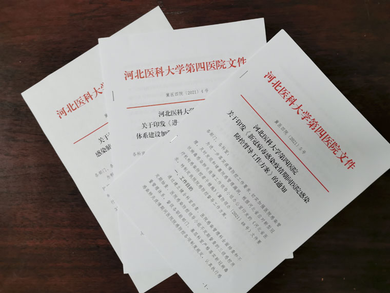 印发《关于进一步加强新冠肺炎疫情医院感染防控工作的通知》、《进一步完善医院感染防控体系建设加强科室感染防控工作的通知》、《新冠病毒感染疫情期间医院感染防控督导工作方案》,完善细化诊疗流程及管理要求,健全医院感染防控三级体系建设,强化落实临床医技科室院感防控具体要求。针对不同患者类别和其所属区域出台多项文件完善诊疗流程,针对医院部分特殊区域制定适时可行的管理规定。