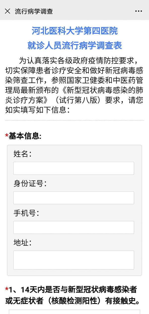 医院不断优化预检分诊管理流程,加强门、急诊预检分诊人员力量,补充有经验的医护人员参加工作,进行体温监测、查看“健康码”。我院首创了电子流行病学调查表进行流行病学筛查,相比以往手写纸质调查表,大大缩短了预检时间,解决了患者因填写时间长、流程繁琐而造成的人员聚集问题。
