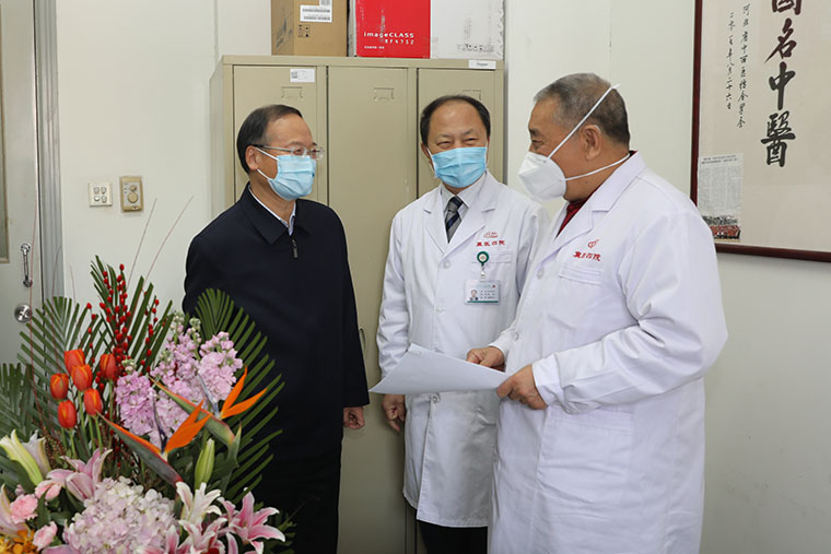 在新春佳节即将到来之际,2月10日上午,河北医科大学党委副书记倪铁军带领校两办、离退办、统战部等处室负责人,来到我院中医科门诊,在河北医科大学副校长、我院党委书记单保恩和党委副书记李晓玲的陪同下,看望慰问了全国名中医、我院中医科刘亚娴教授。