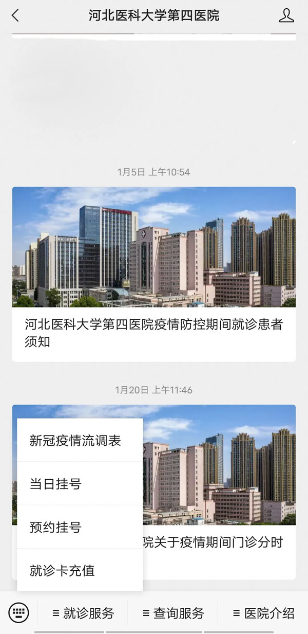 1. 河北医科大学第四医院微信公众号 → 选择“就诊服务” → 预约挂号