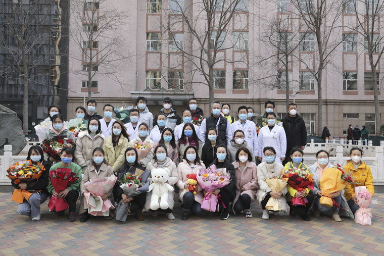 相关科室的同事们纷纷与队员们拥抱致敬、合影留念,前庭广场洋溢着幸福的味道。