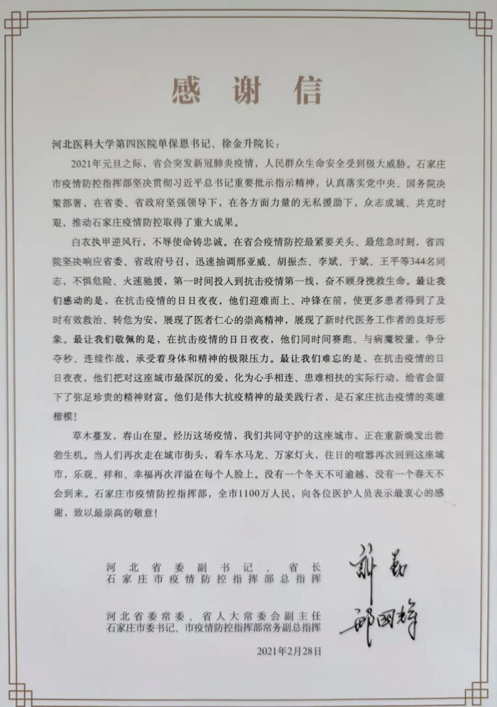 单保恩书记表示,医院闻令而动,尽锐出战,四院力量凸显在抗“疫”一线。面对严峻复杂的防控形势,院党委果断决策,迅速投入战斗,全员取消休假,成立防控领导小组办公室,坚持把疫情防控作为头等大事,统一领导、统一调度,第一时间成立30人医疗队伍,1月6日进驻市五院开展新冠感染患者救治工作,随后根据疫情救治工作安排转战省胸科医院。之后,再次增加7名医务人员支援市人民医院疫情防控,派5名医师进驻省二院东院进行支援。还抽调疫情救治省级专家组5名医师参与各定点救治医院开展患者会诊、驻点救治工作。河北省胸科医院是河北省疫情救治主阵地,我院先后派出45名医护技人员支援该院一线抗疫工作,进驻当天便作为第一批整建制团队进入ICU病区,投入危重症患者的救治工作中。我院团队从第一批进入胸科医院,到最后一批撤离,连续工作近两个月,受到省卫健委、省胸科医院和兄弟医院领导和同事的认可。为配合政府核酸采集工作,我院先后派出核酸采集医疗队625人次,赴藁城区、长安区、裕华区、高新区、无极县等地,完成核酸采集90多万人次。为了节省防护物资和更快的完成任务,队员们常常连续工作8-10个小时,不吃、不喝、不上厕所,把四院精神带到疫情防控的第一线,得到了政府及百姓的认可。