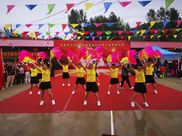 在庆祝中国共产党百年华诞之际,我院驻隆化县九屋营村工作队为活跃村民的业余文化生活,积极引导脱贫群众展示健康活泼、积极向上的精神风貌,作为建党100周年系列庆祝活动之一,协助举办了以“坚定不移听党话、矢志不渝跟党走”为主题的大型广场舞联谊活动。