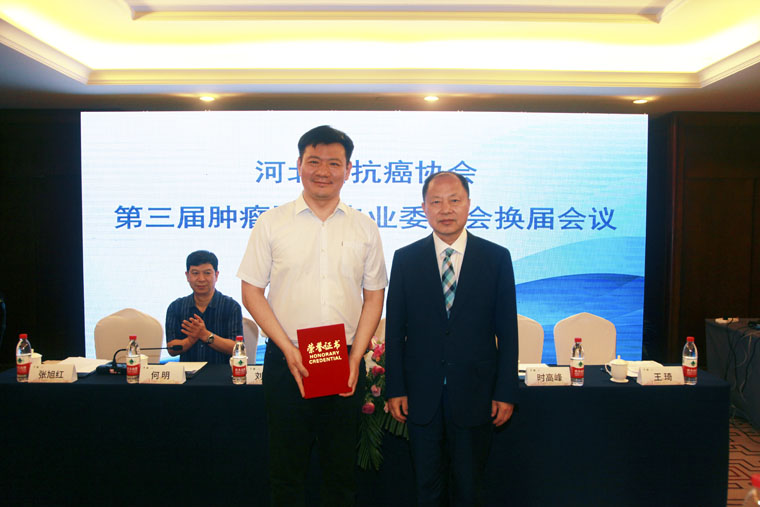 6月19日,由河北省抗癌协会与河北省健康管理学会共同主办,我院承办的2021河北省抗癌协会肿瘤影像专业委员会学术会议在石家庄举行,逾1200人参会。河北省抗癌协会肿瘤影像专业委员会换届会议于前一日举行,我院CT磁共振科副主任王琦当选主任委员,CT磁共振科主任时高峰担任名誉主任委员。河北省抗癌协会理事长、我院党委书记单保恩教授为王琦颁发证书并肯定了影像专业的发展在肿瘤诊治中的作用,希望这个蓬勃发展的平台能够为我省肿瘤诊断领域的发展继续贡献力量。