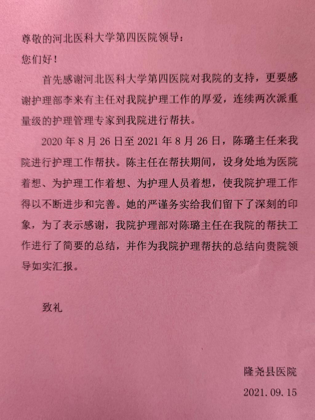 近日,隆尧县医院给我院发来感谢信,信中记录了陈璐副主任工作期间的点点滴滴,字里行间表达了对我院护理部以及帮扶专家的诚挚谢意。