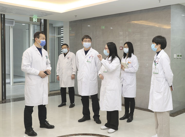 赵群副院长一行听取了相关科室疫情防控期间的重点举措,实地查看了南楼病房、发热门诊、手术室等区域的探视管理以及胸二病区小组式护理员的上下班打卡制度,并对教学楼学生学习、生活的常态化管理情况进行了深入了解,指出在医院疫情防控整体安排部署下,加强第三方陪护人员与学生管理的重要性,非必要不外出,减少外来人员流动,完善科学、有序的规范化管理。