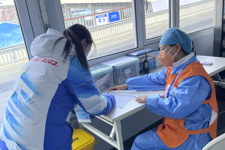 为了便于医疗保障队更好地开展工作,院党委成立了冬奥医疗保障队临时党支部,李峥担任支部宣传委员,配合医疗官何宏涛副院长,协助完成环外团队的学习、工作和生活。刚到观众医疗站的前几天,工作需要尽快铺开,任务繁琐且艰巨。她与大家一起在医疗站有限的场地内,整理医疗物资、核对救治药品、优化工作流程、检查各种仪器、模拟演练。回到宿舍则要总结一天的工作,接发生活物资,与医院宣传部老师沟通收集宣传资料,接收传达多种信息,包括每日的赛事通知、摆渡车辆安排、每日排班、宿舍管理规定、网络培训资料等。每当晚上打开视频想与孩子聊天时,往往是孩子们都睡了,只好反复看着手机相册里的照片。后来,待工作理顺了,才得以有时间与两位“留守儿童”视频,一天的疲劳一扫而光。