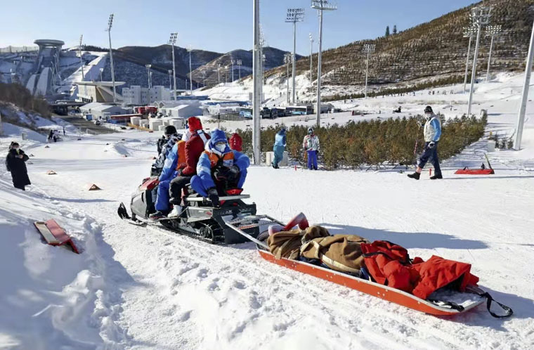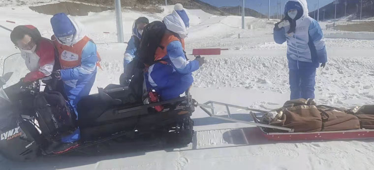 3月1日,世界残奥北欧滑雪联合会专家汉斯皮特在工作时,随机选取时间和地点,模拟运动员在比赛过程中突然倒地,紧急呼叫医疗救援。医疗服务领域FOP医疗站医护人员得到指令后迅速到位,第一时间检查伤情,给予肢具外固定和包扎后,使用救援雪橇船迅速转运至指定地点,全程仅用时8分钟。演练结束后,汉斯皮特对医疗救护人员快速反应、快速转运、沟通顺畅等给予了充分肯定。