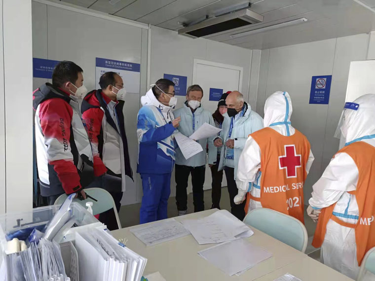 在冬奥会和冬残奥会医疗保障期间,国际奥委会医疗和科学部主席沃尔夫冈·舍伯斯伯格、主任巴吉特和成员大卫·齐德曼;国际残奥委会医学科学部主席杰米·基西克、医疗经理朱迪思·范德维恩及4名委员会成员先后多次来到我院负责的国家冬季两项中心运动员医疗站和FOP医疗站,对运动员医疗站自动心肺按压系统(LUCAS)、自动体外除颤器(AED)、危重症抢救药物、医疗固定支具、牵引器材以及无障碍设施进行查看。在详细考察了电子病例管理系统录入、特殊药品储存、赛道急救转运流线的运转情况后,赞扬我院医疗保障工作做到了“细节之处见功夫”。