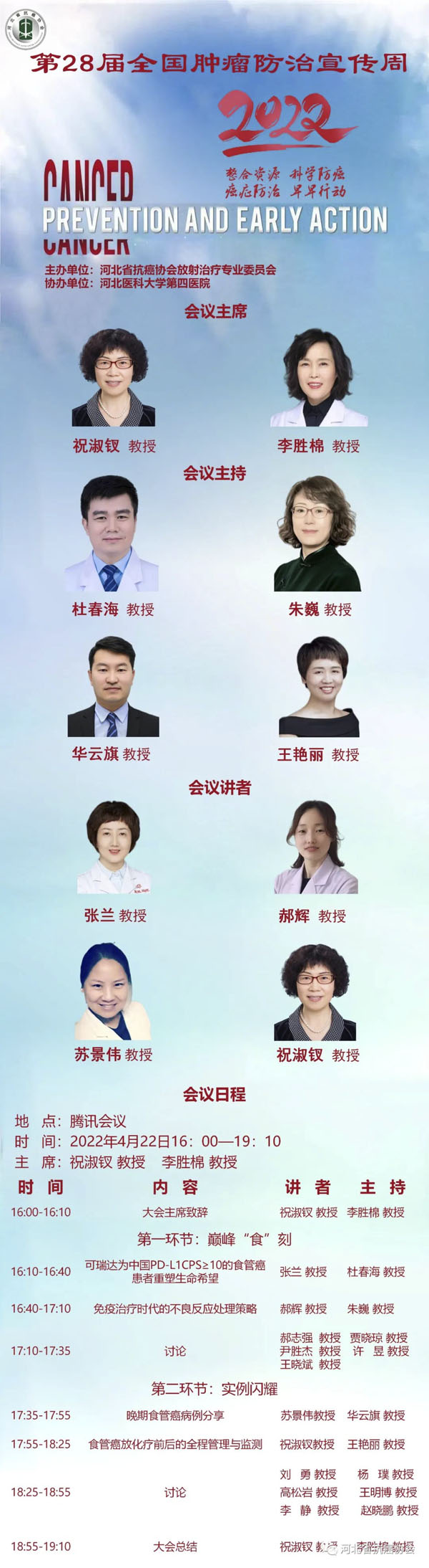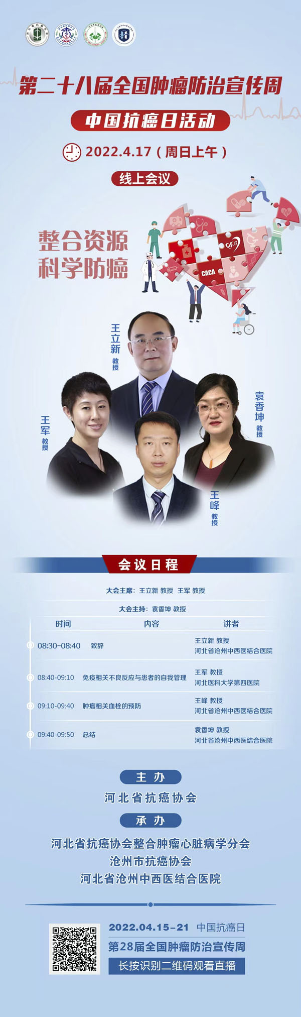 4月15-21日是我国第28个全国肿瘤防治宣传周,今年宣传周主题是“整合资源 科学防癌”。为贯彻落实健康中国癌症防治行动,进一步提高全社会癌症防控意识,营造全民防癌抗癌的良好氛围。由河北省抗癌协会、河北省肿瘤防治办公室主办的第28届全国肿瘤防治宣传周/中国抗癌日,河北省启动仪式将于2022年4月15日在保定正式启动。
