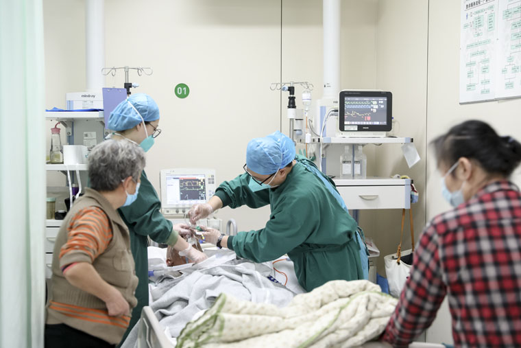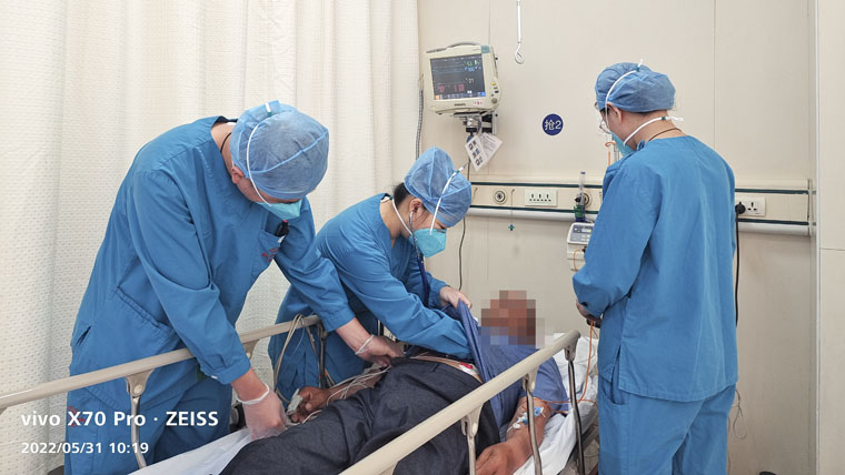 另一个重要任务是保证发热门诊留观病区中重症病人的救治。每当危重的发热病人病情恶化而急需抢救治疗时,急诊人都会冲锋在前,勇担重担。“一线生机、永不放弃”,虽然严密的防护服使他们的诊察和抢救行动受限,但他们能够克服种种困难,以精湛的抢救治疗技术使危重患者转危为安,顺利度过闭环管理期。此外,急诊科与发热门诊还建立了联动机制,当危重病人出室后进入院区,急诊人会带齐设备,第一时间到达发热门诊接应,并全程护送直至病房。