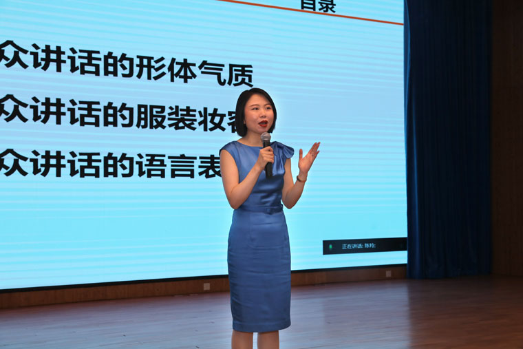 崔妍老师以《当众讲话的精彩绽放》为题,结合实际分享了演讲思维的建立、演讲技巧的运用、讲台服装和妆容的审美、上台后的形体与表情管理等方面的知识。