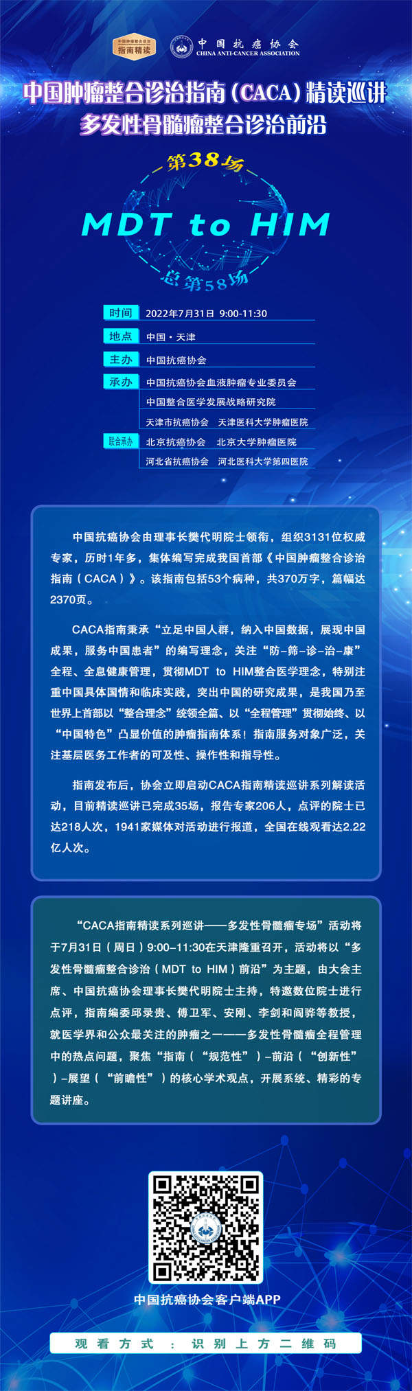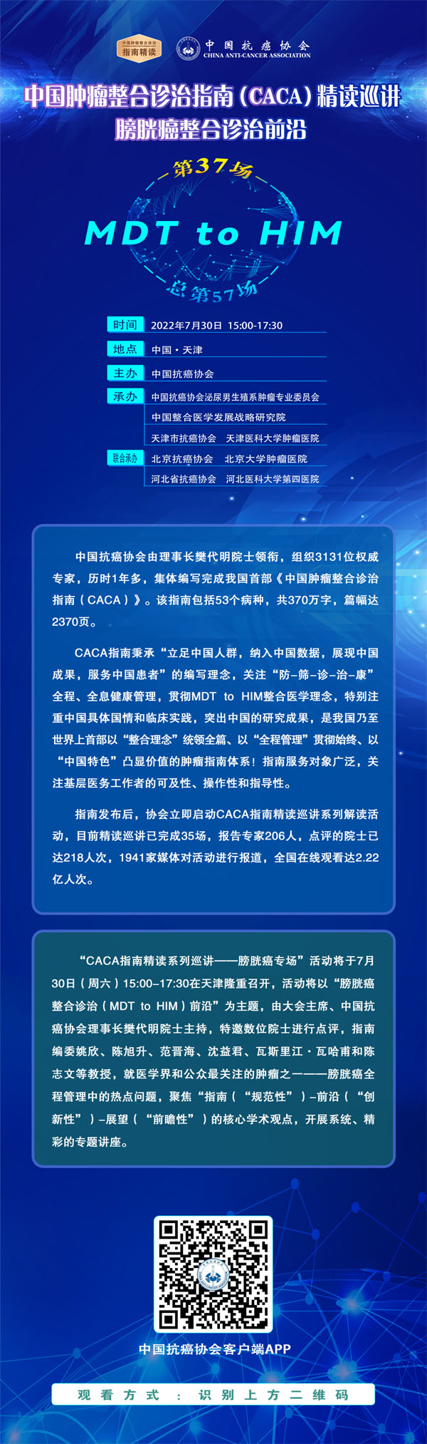 7月30-31日,由天津市抗癌协会、天津医科大学肿瘤医院承办,河北省抗癌协会、我院与北京市抗癌协会、北京大学肿瘤医院联合承办的“中国肿瘤整合诊治指南(CACA)精读巡讲系列活动”将在中国抗癌协会发祥地——天津收官。我院作为分会场之一,在本部6楼报告厅进行现场直播。