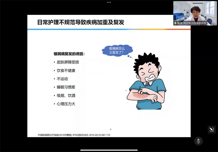 为了帮助银屑病患者及家属客观认识银屑病,避免乱投医、滥用药,在第19个“世界银屑病日”到来之际, 10月28日,我院皮肤科于线上举办银屑病患教活动,科室负责人张燕教授以《做聪明的银屑病患者》为题分享治疗经验,受到了患者一致好评。