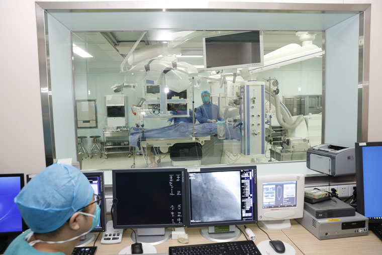 5年前曾行PCI术的一名患者因“心绞痛”再次入院,该患者冠心病史已有20余年,频发心绞痛且伴有严重的高血压、糖尿病等基础性疾病。如何既能有效治疗,又能避免胸骨正中开胸的巨大创伤?这是摆在大家面前的一道难题。经过心血管内科马景涛教授团队和心脏血管外科赵永波副主任团队的缜密磋商,最后决定行“PCI(经皮冠状动脉介入治疗术)+小切口冠状动脉搭桥术”。关键时刻,DSA复合手术室成功解除燃眉之急。