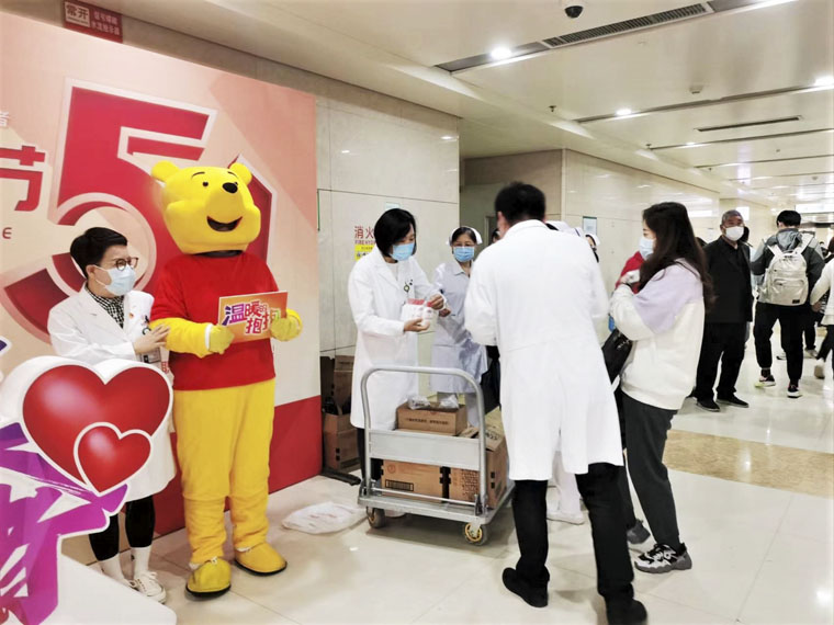 活动中,工会的两位职工穿上布朗熊和维尼熊的人偶,向职工们“温暖的拥抱”、赠送护手霜,并向大家道一声“辛苦了”!很多职工表示,通过活动收获了来自医院的关怀和温暖,劳动最光荣,奋斗最幸福,新时代更要立足岗位、脚踏实地,用辛勤劳动创造更加美好的明天。