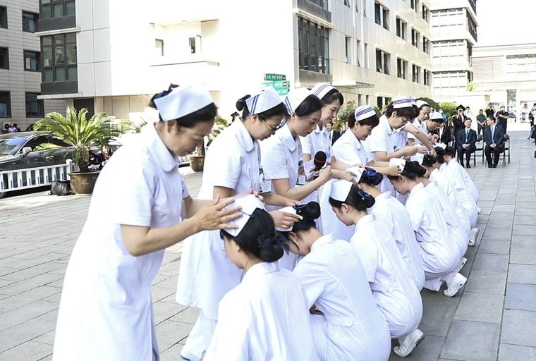 护理学院、护理部、护理教学办公室的护理前辈为毕业生代表进行了庄严神圣的授帽仪式。洁白的燕帽承载了护理前辈的期望,希望同学们发扬“燃烧自己,照亮他人”的精神,把真诚的爱心无私奉献给每一位病人,把毕生精力奉献给护理事业。