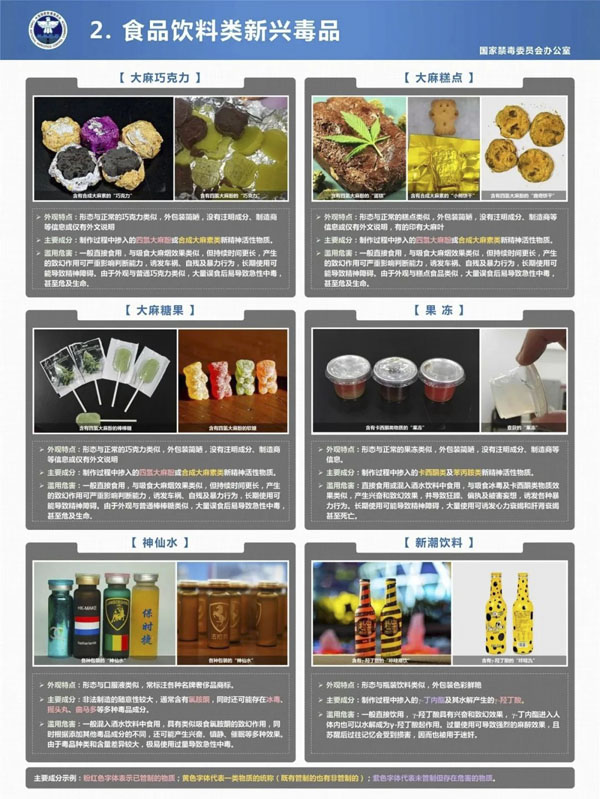 新类型毒品增多,识别查处难。《2022年中国毒情形势报告》中指出:海洛因、冰毒等滥用品种仍维持较大规模,大麻吸食人数逐年上升,新精神活性物质滥用时有发现,花样不断翻新,包装形态不断变化,有的甚至伪装成食品饮料,出现“毒邮票”、“毒糖果”、“毒奶茶”,极具伪装性、隐蔽性、诱惑性。疫情防控下,常见毒品难以获取,吸毒人员转而寻求其他物质替代,各地查处滥用杜冷丁、安眠酮等管制药物,吸食含合成大麻素、“笑气”、氟胺酮等替代物质情况增多。