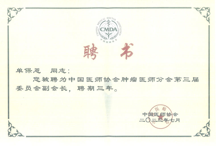 单保恩教授是河北省肿瘤研究所所长,河北省肿瘤防治办公室主任,河北省抗癌协会理事长,享受国务院特殊津贴专家、全国优秀科技工作者、全国优秀院长、国家五一劳动奖章获得者、河北省高端人才、省十大优秀发明者。是国际肿瘤基因与细胞治疗学会候任理事长,中国欧美同学会医师协会副会长,在中国抗癌协会、中国免疫学会、中国诱变剂学会等9个国家一级学会任常委。