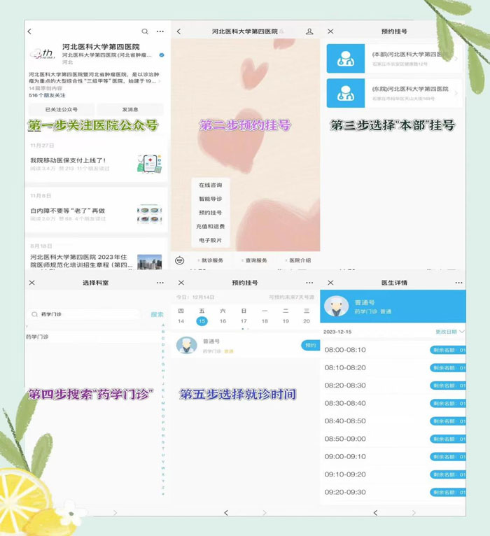挂号流程:可通过医院官方微信公众号“河北医科大学第四医院”预约挂号,具体如下图所示;就诊时请把正在服用的药品带上或记录好药名,同时带上近期化验单。