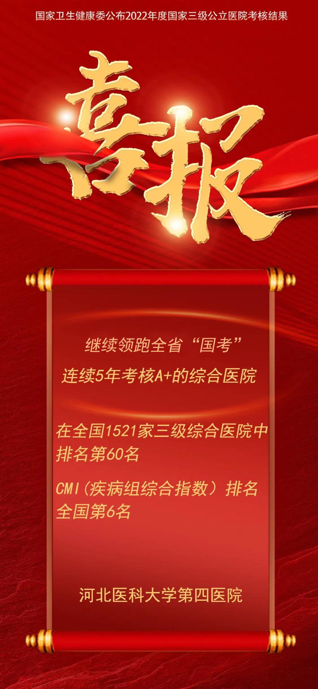 全国三级公立医院绩效考核开展以来,我院已连续5年位居河北省第一,四次进入全国前100名,这是全体四院干部职工团结一心、奋勇向前的生动答案。百尺竿头,更进一步,在习近平新时代中国特色社会主义思想的指导下,在上级党委和医院党委的正确领导下,我院始终坚持“以人民健康为中心”的服务理念,继续以昂扬的斗志和饱满的热情谱写医院高质量发展新篇章,不断满足人民健康新期待,让人民群众有更多获得感。