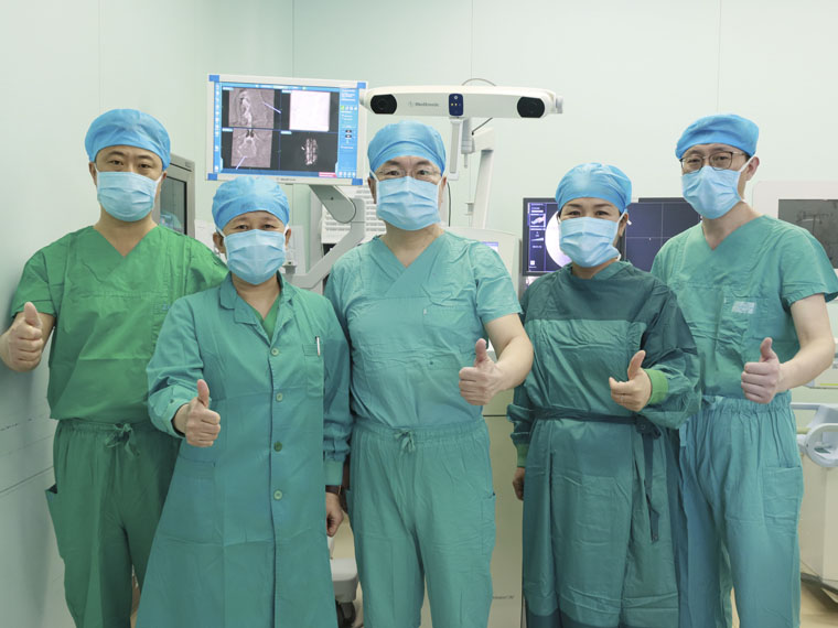 患者症状严重,情况较差,急需手术解决病痛。骨科与手术室、麻醉科多次沟通,针对患者年龄较高、手术范围偏大等难题,细致商讨最有利于患者的解决方案。手术室积极整合骨科3DC臂与手术导航系统设备资源,术中,荀建军主任团队利用导航精准定位,清楚看到患者椎体的水平面、冠状面、矢状面等,精准置入椎弓根螺钉,彻底减压,松解脊神经,切除转移肿瘤组织,手术顺利完成。在智能导航系统的帮助下,该手术比常规手术节约近三分之一的时间,风险低且出血量明显减少,术中使用大型C臂产生的辐射量得到有效降低。术后病人四肢肌力良好,腰背部疼痛憋胀明显减轻。