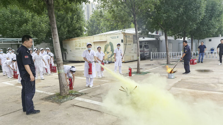 东院保卫处吕冬霜和本部保卫处王海兵,为同学们带来消防知识培训,现场演示了灭火器、消防水带等各类消防设施的使用方法,现场模拟火灾进行疏散演练,每位同学都拿起灭火器实地体验了灭火操作,较熟练地掌握了“提、拔、握、压”的操作流程。