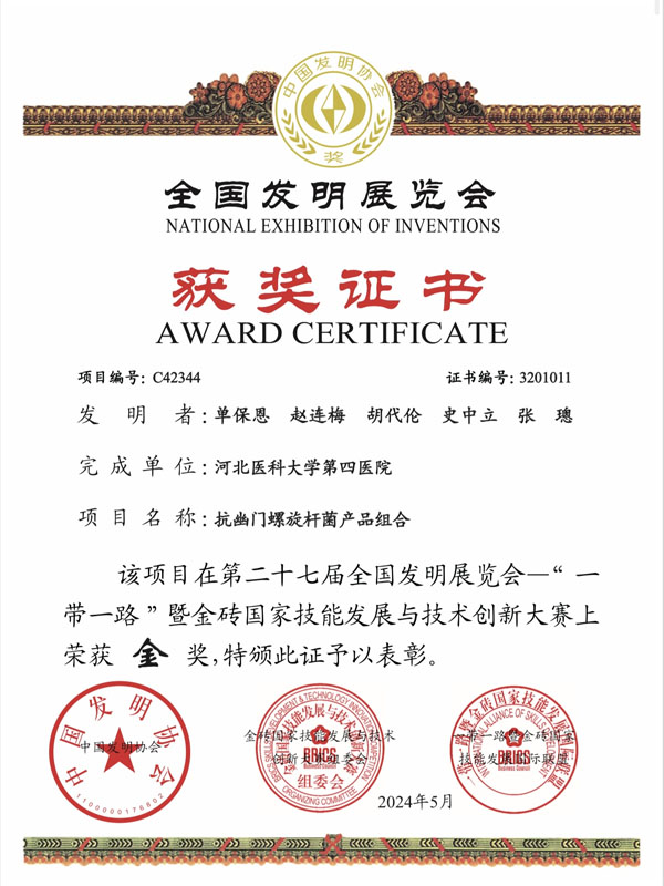 近日,由中国发明协会主办,国家科技部、中国科学技术协会、中华全国总工会等单位支持,石家庄市人民政府承办的第二十七届全国发明展览会暨一带一路金砖国家技能发展与技术创新大赛举办,我院推荐的“幽门螺旋杆菌产品组合”荣获金奖。目前,该项目已获得12项国内外发明专利,且已获得商标注册和认证。