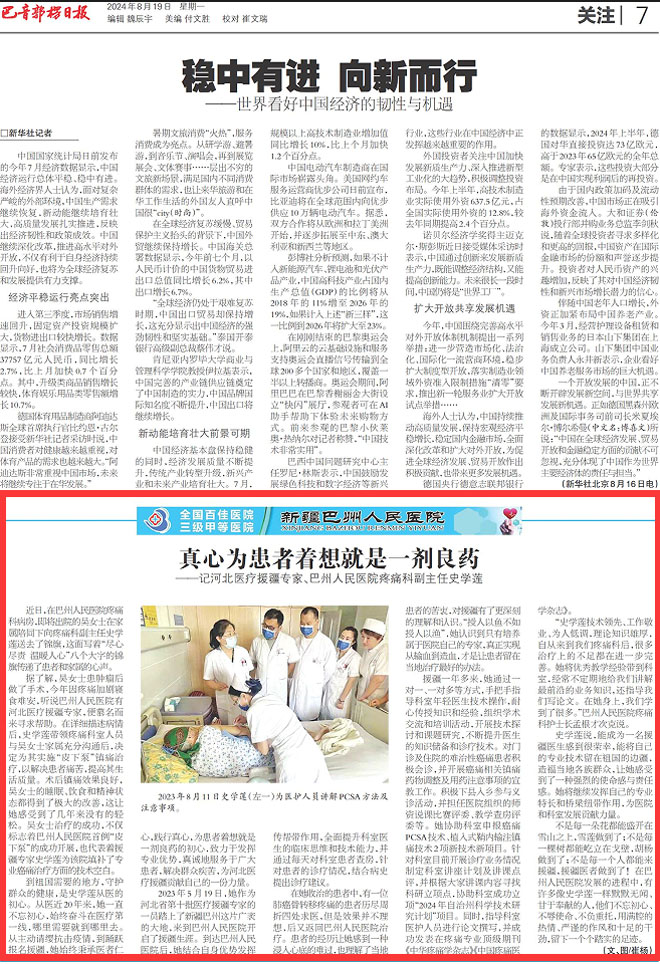 据了解,吴女士患肿瘤后做了手术,今年因疼痛加剧寝食难安,听说巴州人民医院有河北医疗援疆专家,便慕名而来寻求帮助。在详细描述病情后,史学莲带领疼痛科室人员与吴女士家属充分沟通后,决定为其实施“皮下泵”镇痛治疗,以解决患者痛苦,提高其生活质量。术后镇痛效果良好,吴女士的睡眠、饮食和精神状态都得到了极大的改善,这让她感受到了几年来没有的轻松。吴女士治疗的成功,不仅标志着巴州人民医院首例“皮下泵”的成功开展,也代表着援疆专家史学莲为该院填补了专业癌痛治疗方面的技术空白。
