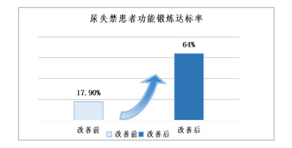 前列腺根治性切除术后尿失禁患者功能锻炼1个月时随访结果显示,较本项目实施前患者的功能锻炼达标率由17.9%提高到64.0%,患者功能锻炼依从性明显提升。