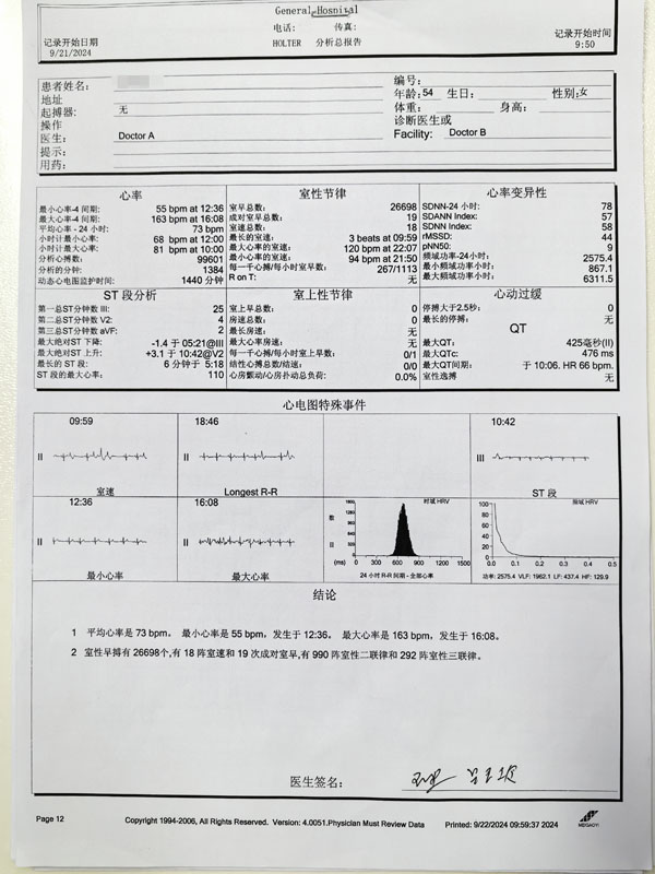 患者史女士主诉心慌、气短伴头晕,偶有胸痛、背痛10余天,已就诊两家医院,症状未得改善,遂就诊于我院心血管内科。患者12导联心电图示,“窦性心律,频发室性期前收缩”;心脏彩超提示,“检查过程中可见频发期前收缩,二尖瓣轻度关闭不全”;24小时动态心电图示,“最大心率为163次/分,室性早搏26698个,有18阵室速和19次成对室早,有990阵室性二联律和292阵室性三联律”。
