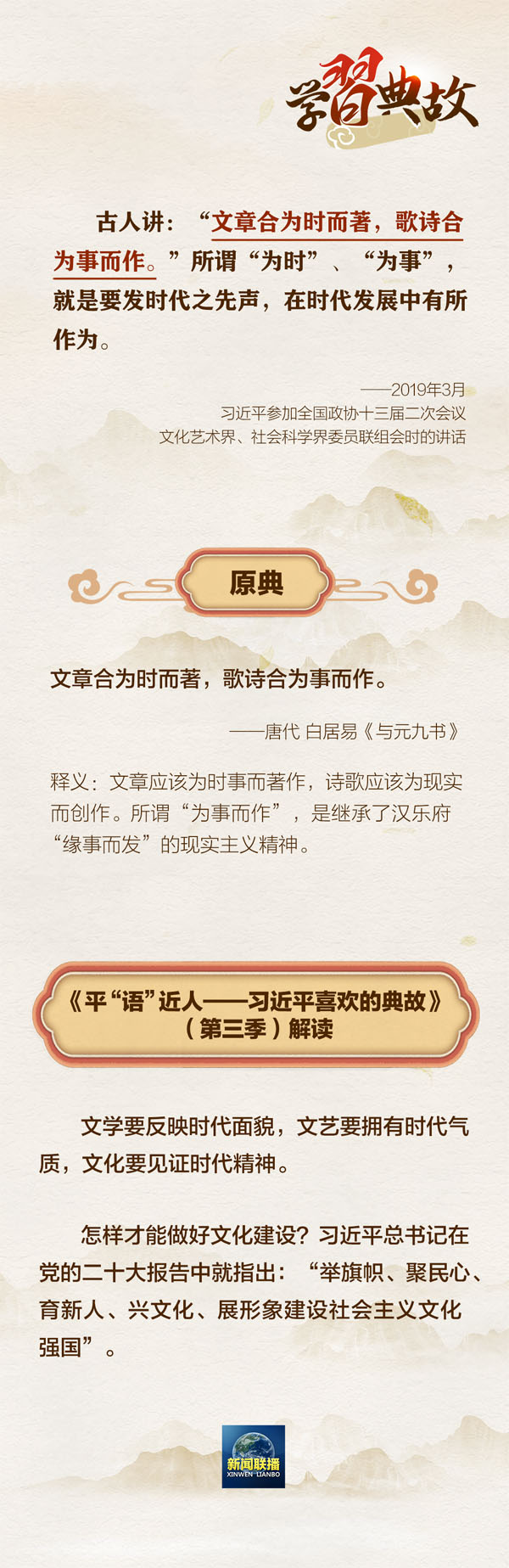 文运同国运相牵,文脉同国脉相连。文化自信是一个国家、一个民族发展中,最基本、最深沉、最持久的力量。党的二十大报告中指出:“全面建设社会主义现代化国家,必须坚持中国特色社会主义文化发展道路。”围绕“文化建设”这一主题,总书记曾讲到哪些典故?一起学习↓↓↓