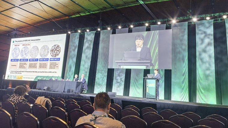 在发言环节,病理科丁妍副主任和李金泽医生代表科室参会,她们以严谨的研究方法、详实的数据和清晰的思路向全球同行展示了乳腺病理最新研究成果,现场专家表达了浓厚兴趣,引发了热烈讨论和交流。在壁报展示区中,病理科的5篇壁报涵盖了肿瘤病理、分子病理、人工智能辅助病理诊断等多个领域,吸引了众多参会者的驻足讨论,展示了科室在病理学研究方面的多元化和创新性,获得了现场专家的高度认可。