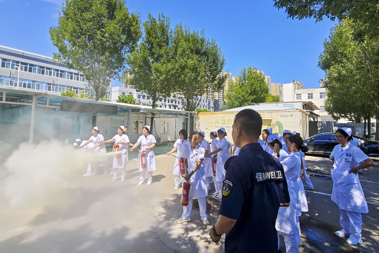 在日常生活安全保障方面,东院保卫处吕冬霜与本部保卫处张国龙就宿舍安全用电知识、火灾预防措施及应急处置流程等进行培训,现场演示了灭火器等消防设施的使用方法。同学们也进行了实际操作。