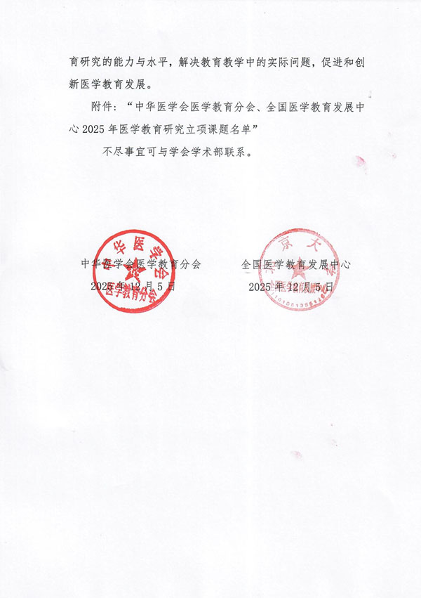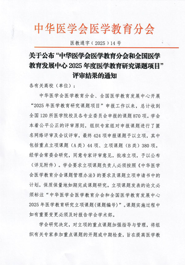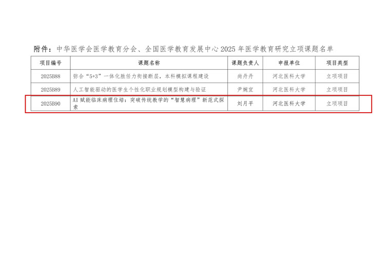 同时,由中华医学会医学教育分会与全国医学教育发展中心联合公布的2025年度医学教育研究课题项目评审结果中,我院病理科申报的《AI 赋能临床病理住培:突破传统教学的 “智慧病理” 新范式探索》经过层层筛选上报,以及专家组匿名网络评审与会议评审,成功入选立项,河北医科大学仅3项获批立项,竞争异常激烈。这也是我院首个获批的中华医学会医学教育研究课题,标志着医院在医学教育创新领域实现重大突破。