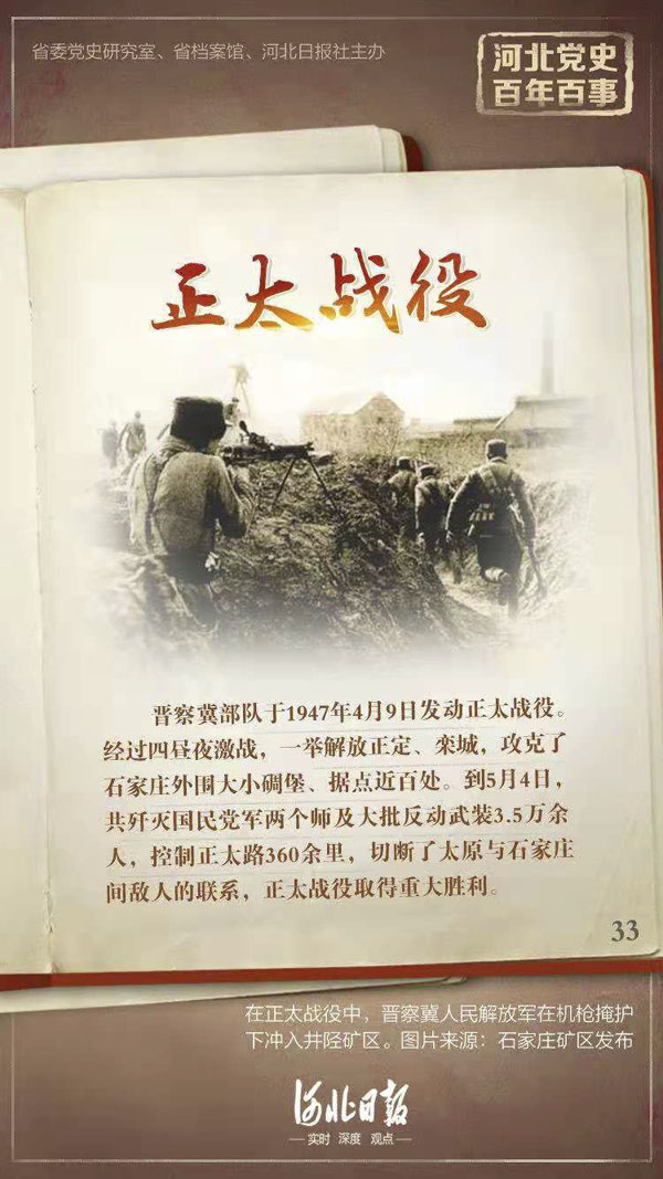 经过半年多的作战,国民党军队被迫放弃全面进攻,改为对解放区重点进攻。河北的国民党军将兵力集中到平、津、保及主要交通干线,同时不断向外进攻以确保战略据点和交通线不受威胁。晋察冀部队为肃清石家庄外围的国民党军,切断敌人交通命脉正太铁路,进一步孤立石家庄之敌,于1947年4月9日发动正太战役。经过四昼夜激战,在地方武装的配合下,一举解放正定、栾城,攻克了石家庄外围大小碉堡、据点近百处,晋察冀野战军还乘胜沿正太路西进,继续扩大战果。经过20多天的战斗,到5月4日,共歼灭国民党军两个师及大批反动武装3.5万余人,控制正太路360余里,切断了太原与石家庄间敌人的联系,正太战役取得重大胜利。