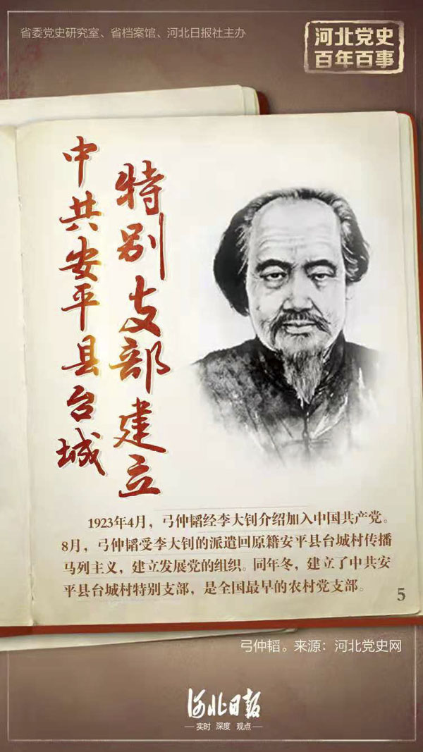 中共安平县台城村特别支部是全国最早的农村党支部。1923年4月,在北京一所小学任教的安平县台城村人弓仲韬经李大钊介绍加入中国共产党。8月,弓仲韬受李大钊的派遣回原籍传播马列主义,建立发展党的组织。他先后在台城村创建“平民夜校”,筹建农会,积极宣传共产主义,培养党的积极分子。同年冬,介绍思想进步、积极肯干的弓凤洲、弓成山加入中国共产党,建立了中共安平县台城村特别支部,受中共北京地委直接领导。