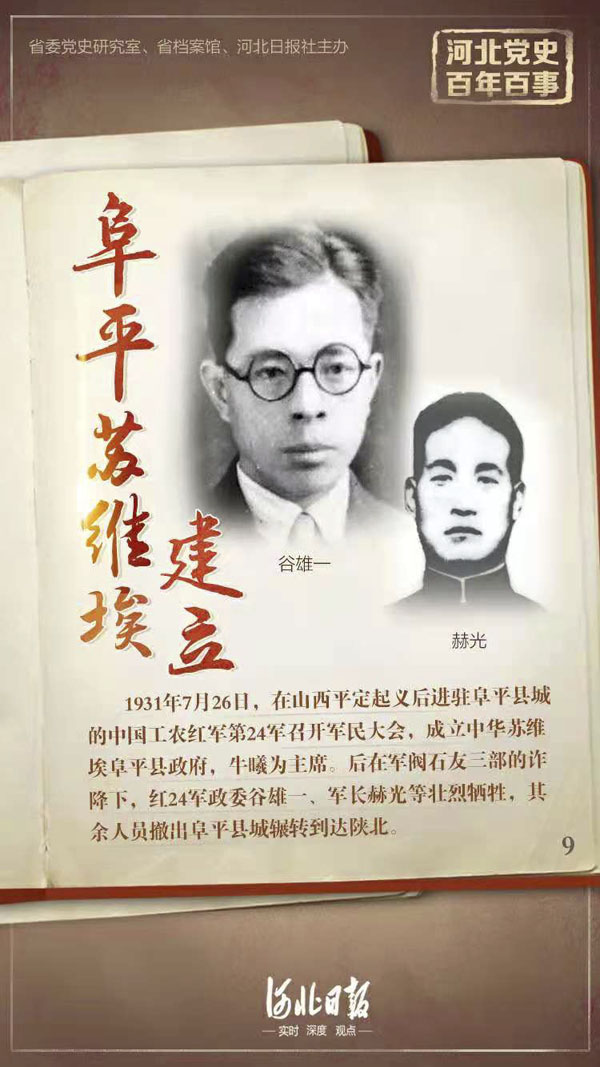 阜平苏维埃是党在华北领导人民建立工农政权的一次伟大尝试。1931年7月26日,在山西平定起义后进驻阜平县城的中国工农红军第24军召开军民大会,成立中华苏维埃阜平县政府,牛曦为主席。县苏维埃成立后,立即清除反动武装,组织农民赤卫队,建立农民、士兵、邮政、教育等委员会,创办穷人学校,同时还派遣宣传队,深入各村镇宣传党的政策和主张。后在军阀石友三部的诈降下,红24军政委谷雄一、军长赫光等壮烈牺牲,其余人员撤出阜平县城辗转到达陕北,参加了刘志丹领导的红军队伍。红24军创建的阜平苏维埃政权虽然仅存半个多月,但它的革命精神永存。
