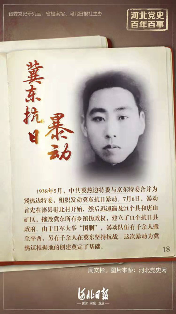 为贯彻落实洛川会议确定的开展冀东抗日游击战争的战略决策,1938年5月,中共冀热边特委与京东特委合并为冀热边特委,胡锡奎任书记,李运昌任军事部长,周文彬为委员,组织发动冀东抗日暴动,并成立冀东抗日联军秘密司令部,高志远任司令,李运昌、洪麟阁任副司令。6月,八路军宋时轮、邓华支队合并组成八路军第四纵队,挺进冀东,策应暴动。7月6日,暴动首先在滦县港北村开始,然后迅速遍及21个县和唐山矿区,有20万人参加,并组成了10万人的抗日武装。四纵和暴动队伍很快先后攻克了平谷、蓟县、乐亭、卢龙、玉田、迁安、宝坻等县城,摧毁冀东所有乡镇伪政权,建立了11个抗日县政府。9月1日,中共中央致电祝贺。由于日军大举“围剿”,暴动队伍撤往平西,在日伪军的围追堵截下,只有千余人到达平西,另有千余人在李运昌的带领下返回冀东坚持抗战。这次暴动沉重打击了日本帝国主义在冀东的统治,为冀热辽根据地的创建奠定了基础。