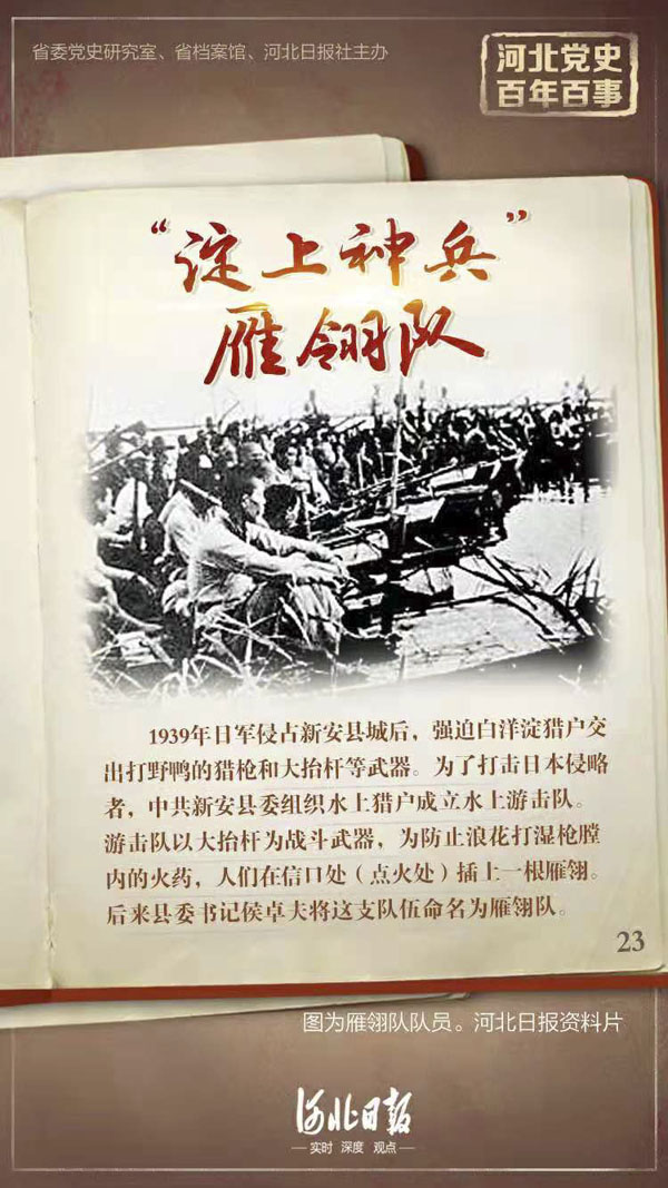 活跃于冀中白洋淀地区的水上游击队。1939年日军侵占新安县城后,强迫白洋淀猎户交出打野鸭的猎枪和大抬杆等武器。为了打击日本侵略者,中共新安县委组织水上猎户成立水上游击队。游击队以大抬杆为战斗武器,为防止浪花打湿枪膛内的火药,人们在信口处(点火处)插上一根雁翎。后来县委书记侯卓夫将这支队伍命名为雁翎队。从此,雁翎队的名字响彻冀中平原。雁翎队活跃在白洋淀的芦苇荡里,神出鬼没地打击日军过往的船只,袭击“扫荡”的日军,打击汉奸、伪军,在中国抗日战争史上留下了光辉的一页。