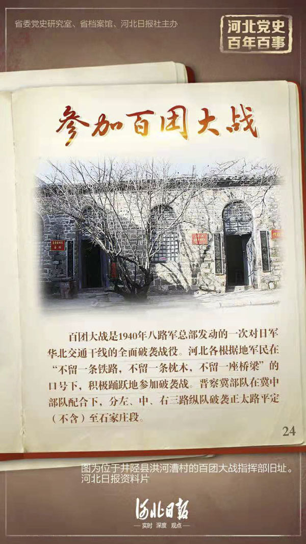 百团大战是1940年八路军总部发动的一次对日军华北交通干线的全面破袭战役。河北各根据地军民在“不留一条铁路,不留一条枕木,不留一座桥梁”的口号下,积极踊跃地参加破袭战。晋察冀部队在冀中部队配合下,分左、中、右三路纵队破袭正太路平定(不含)至石家庄段。冀中区抗日军民24万余人参加破袭战,对平汉路石家庄至涿鹿段、北宁路平津段以及石德铁路、津浦铁路、沧石公路、平大公路等进行破袭。冀东区发动群众万余人配合主力,对北宁铁路开平至古冶段及公路、桥梁和通讯设施进行破坏。冀南区共抽调8个主力团及五分区各县游击队参战,使日军华北交通干线全面瘫痪。